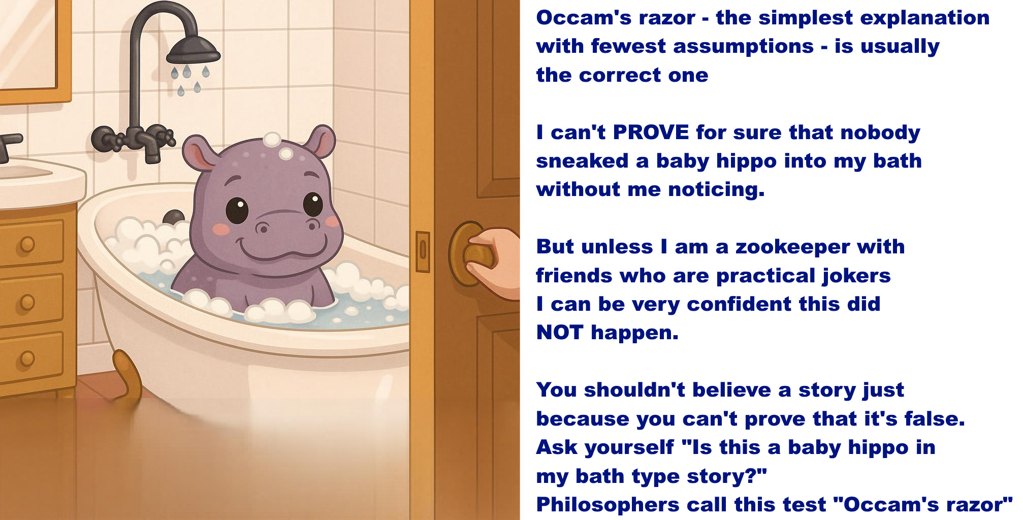 You shouldn’t believe a story just because you can’t prove that it’s false. Ask yourself “Is this a baby hippo in my bath type story?” Philosophers call this test “Occam’s razor”