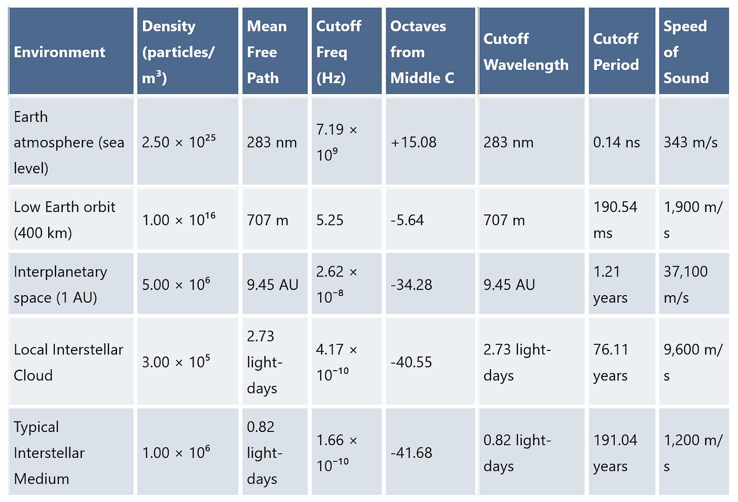The highest pitch sound that can travel through interplanetary space near Earth is more than 34 octaves BELOW middle C.